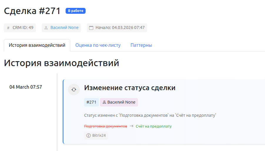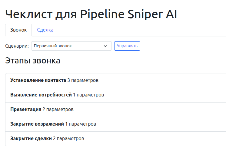 Теперь можно настраивать чеклисты для звонков и сделок. На странице настроек чеклиста появился дополнительный таб для сделок. Чеклисты для сделок работают так же - их можно разделять по сценариям и этапам. Так же в рамках обновления исправлен баг, когда было невозможно удалить сценарий.