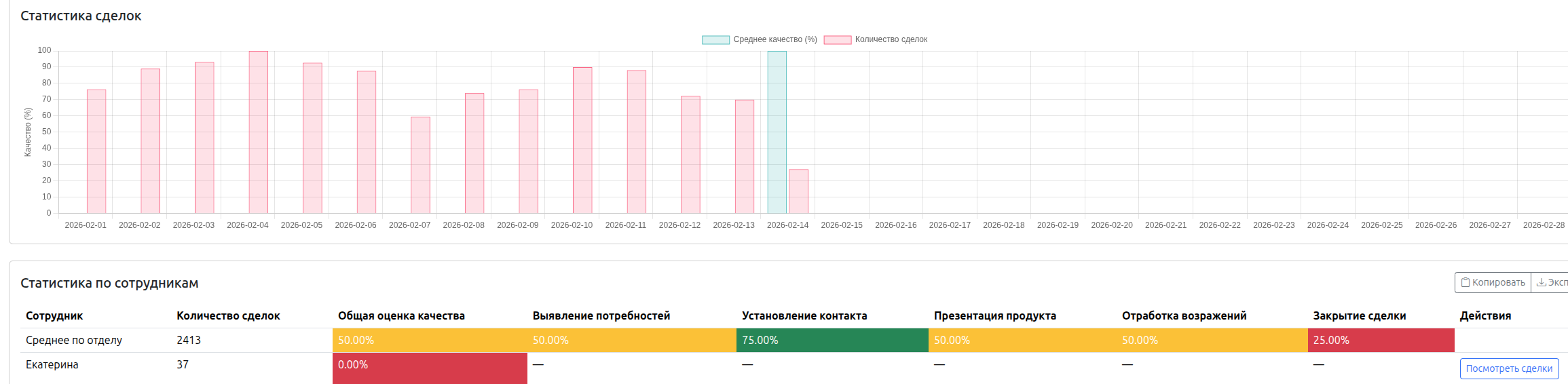 Добавили дашборд по чеклистам для сделок. Логика такая же как и для звонков - по вертикальной оси сотрудники, по горизонтальной этапы чеклиста.