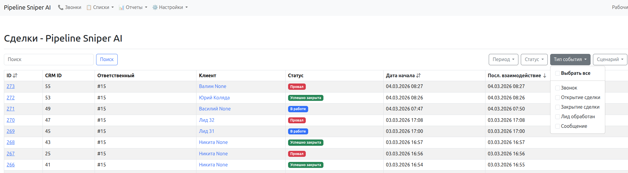 Обновили таблицу сделок - добавили фильтр по сценарию сделки и типу события внутри таймлайна сделки