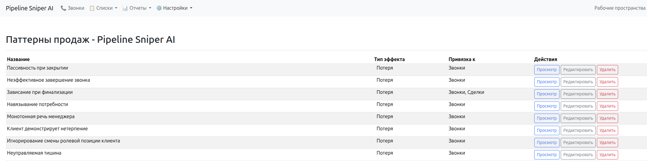 Вернули раздел паттернов, для возможности индивидуальной настройки для каждого клиента. В настройках паттерна теперь можно указать к каким сущностям он может быть применен (звонок и/или сделка)
